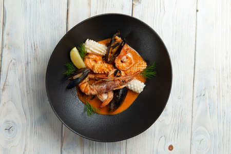 Seafood soup with shrimps, mussels, prawns and squid in tomato sauce