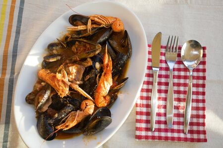 typical dish of Italian cuisine, Fish soup at sixty without thorns: mussels, shrimps, Smooth-Hound, monkfish in tomato sauce with Tropea onions, white wine, garlic and parsley