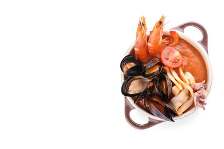 Pot of tasty Cacciucco soup on white background