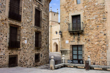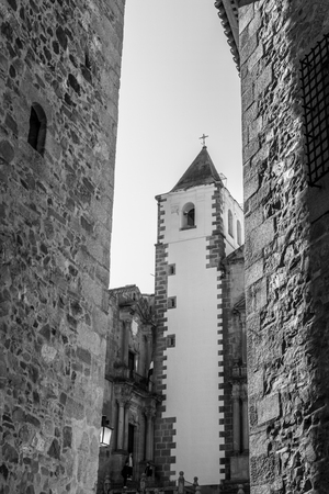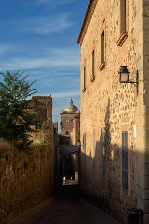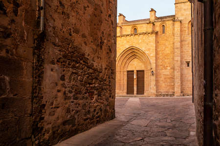 View of Santa Maria Cathedral, from Arco de la Estrella street, in the historic city center of Caceres, Spain.