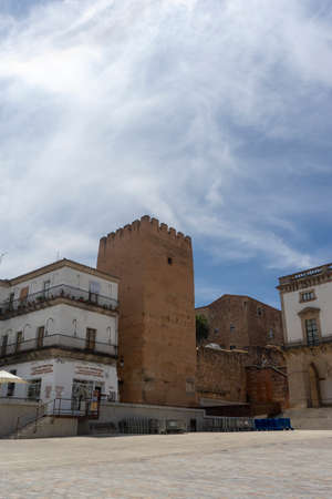 CACERES,SPAIN - MAY 24,2022 - View at the Mayor place with Bujaco tower and Town hall of Caceres. Caceres is a city of Spain located in the autonomous community of Extremadura in Spain.