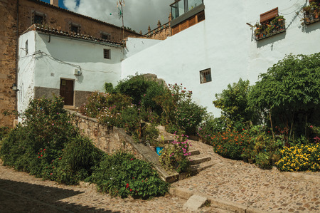 House facade with white walls, stairs, flower pots and plants in front of cobblestone alley at Caceres. A cute and charming town with a fully preserved medieval city center in western Spain.