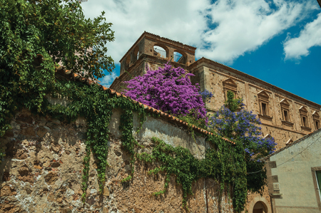 Old stone buildings with flowering trees and bindweed in a sunny day at Caceres. A cute and charming town with a fully preserved medieval city center in western Spain.