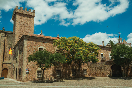 Old building and flowered tree in front of cobblestone square, in a sunny day at Caceres. A cute and charming town with a fully preserved medieval city center in western Spain.