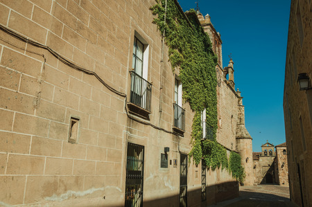 Caceres - July 03, 2018. Narrow alley with old stone buildings, one of them covered by creepers at Caceres. A cute and charming town with a fully preserved medieval city center in western Spain.