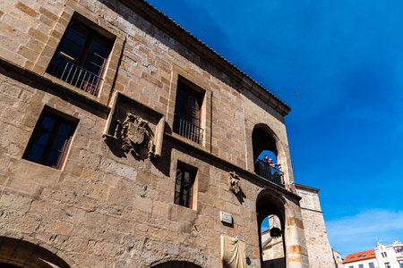 Zamora, Spain - April 7, 2023: The Old City Hall. Low angle view against blue sky