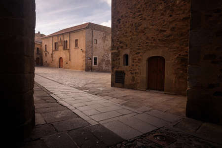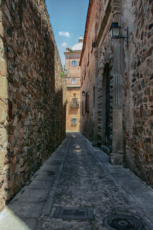 Caceres, Spain - November 09, 2019: Alley with old stone buildings at Caceres, Extremadura, Spain. A cute and charming town with a fully preserved medieval city center in western Spain.