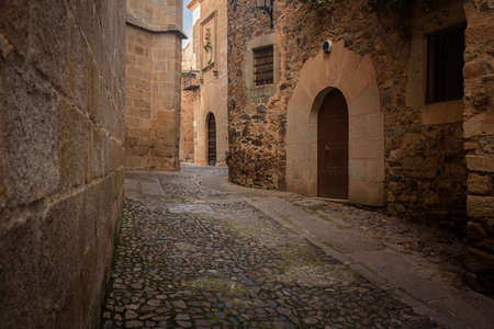 Alleys with old stone buildings at Caceres, Extremadura, Spain. A cute and charming town with a fully preserved medieval city center in western Spain.
