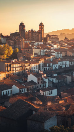 Historic town of Cceres basks in the golden hour light, highlighting its medieval architecture and ancient towers, creating a picturesque landscape that enchants visitors.