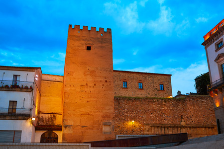 Caceres, Spain - November 08, 2019: Bujaco Tower, Torre de Bujaco at night in Caceres Main Square, Extremadura, Spain The most important tower and one of the symbols of the city.