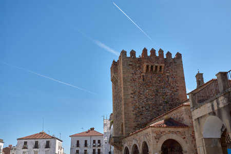 Bujaco Tower rises imposingly above Caceres Plaza de Armas, with its 12th-century Moorish masonry in the foreground and a clear sky that highlights the contrast between the historic and the urban, ideal for Illustrate cultural heritage, medieval history, or monumental tourism