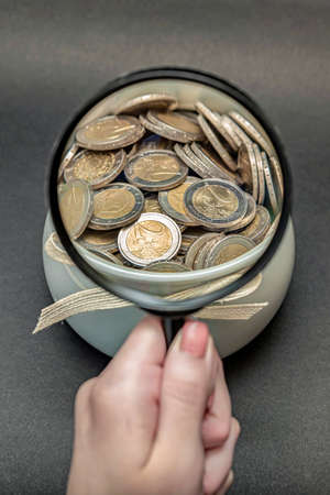 Magnifying glass in hand aimed at a piggy bank with euro coins. Finance savings and accumulation concept