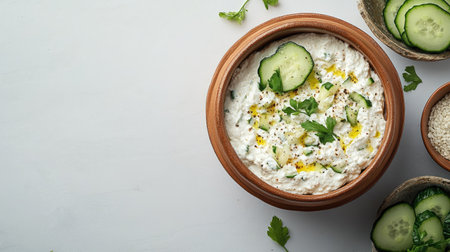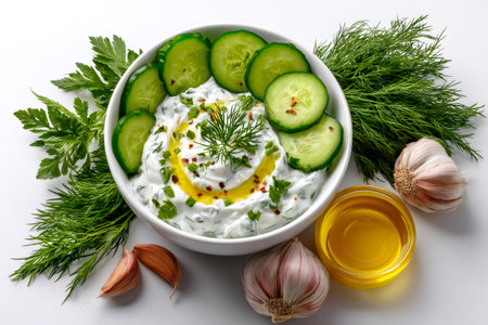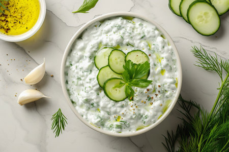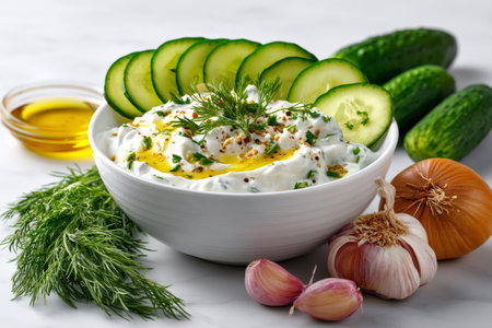 Bowl of Greek tzatziki yogurt dip with fresh cucumber slices, dill, parsley, garlic cloves and olive oil