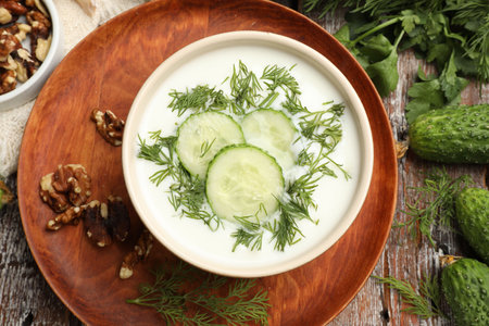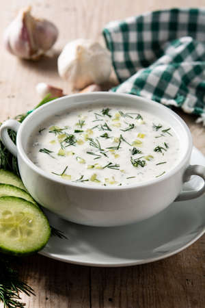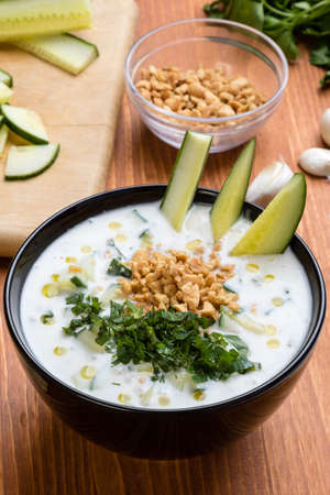 Traditional summer cold soup of homemade yogurt, cucumbers and fresh herbs on a wooden table