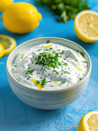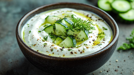 This image features a creamy yogurt sauce topped with fresh cucumber slices and herbs, beautifully presented in a rustic bowl. Perfect for enhancing meals.