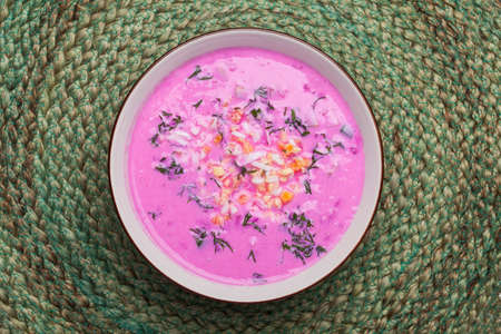 Traditional lithuanian cold beet pink soup, prepared of cucumber, beetroot, eggs and sour cream, called saltibarsciai