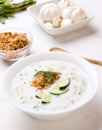 cold fresh tarator soup with cucumber and nuts in white bowl