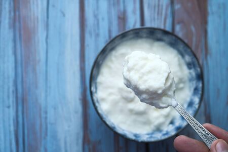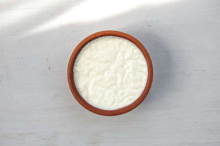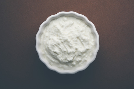 Plain curd or yogurt or Dahi in Hindi, served in a bowl over moody background. Selective focus
