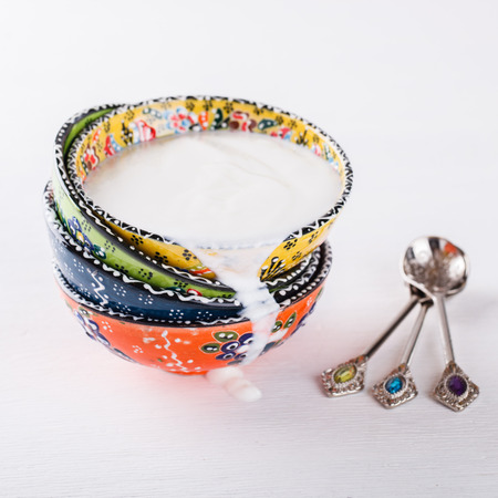 Yogurt,ayran homemade, traditional Turkish ceramic dishes.selective focus.