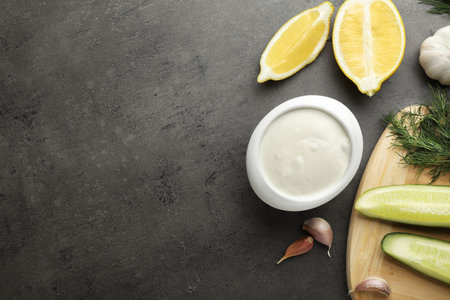 Flat lay composition with cucumber sauce and ingredients on gray background. Space for text