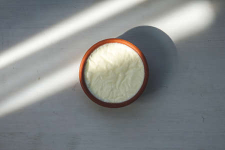 Dairy Organic Product Fresh Healthy Yogurt in Clay Dishes Top View