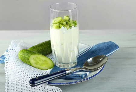 Cucumber yogurt in glass, on color napkin, on wooden table, on gray background