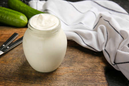 Greek yogurt in a wooden bowl on a rustic wooden table. Selective focus