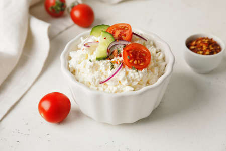Cottage cheese, tomatoes, dill and sour cream in a bowl. Space for text.