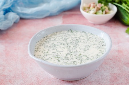 Summer light cold yogurt soup with cucumber, radish, eggs and dill on the table