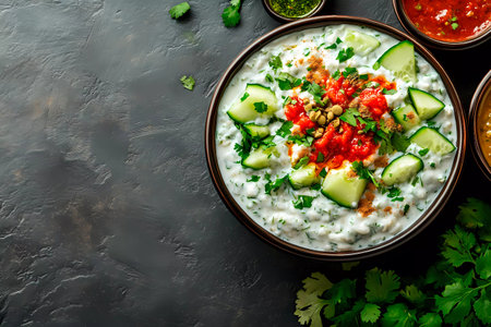 Freshly prepared cucumber salad features yogurt, spices, and vibrant toppings, presented in a bowl alongside various condiments. Perfect for a summer meal or appetizer.