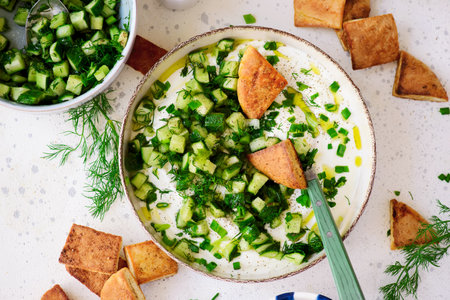 Whipped feta with cucumber, dill and green onion salad in a ceramic bowl with toasted pita pieces. selective focus.top veiw