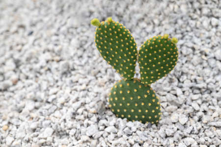 Close-up of Opuntia Microdasys, Bunny Ear cactus, a succulent plant with a flat green stem and elliptical pads. Decorated with small white pebbles in the rock garden. Free space for text.