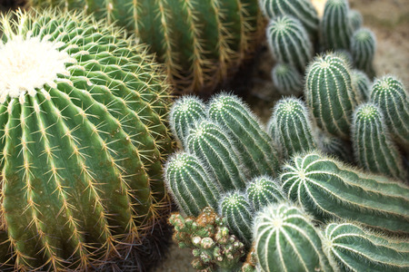 Group of decorative cacti inside the greenhouse in the tropical botanical garden