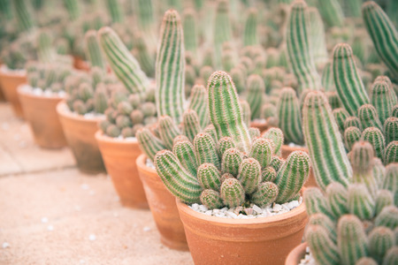 Gardening and growing concept. Cacti in pots growing in the greenhouse