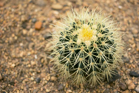 Close up of golden barrel of Echinocactus grusonii. Exotic prickly plant close up. Top view.
