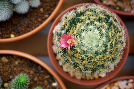 Cactus flowers, Mammillaria schiedeana with pink flower is blooming on pot, Succulent, Cacti, Cactaceae, Tree, Drought tolerant plant.