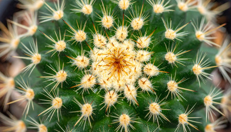 Abstract macro close-up of the organized pattern of needles on a green cactus.