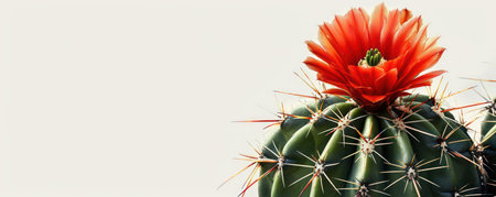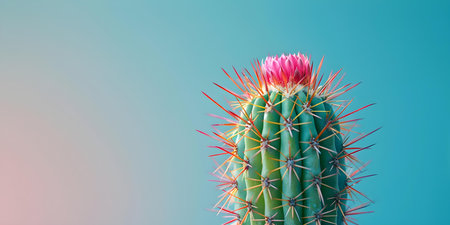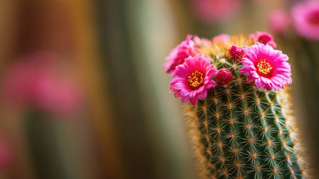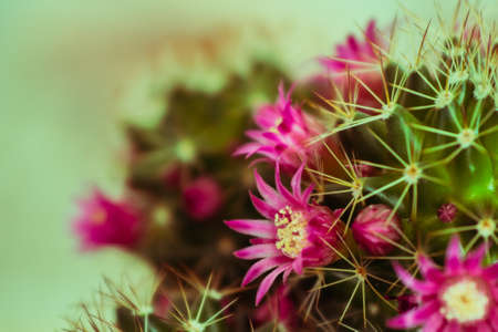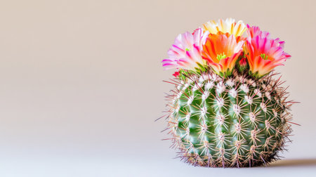 Blooming Mammillaria spinosissima cactus, spiny pincushion with colorful flowers, placed on a minimal background with ample space for design