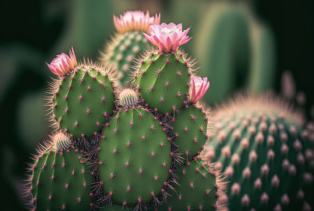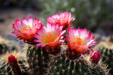 A stunning close-up view of vibrant cactus flowers blooming in a natural setting. The soft focus background enhances the beauty of this unique desert plant.
