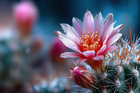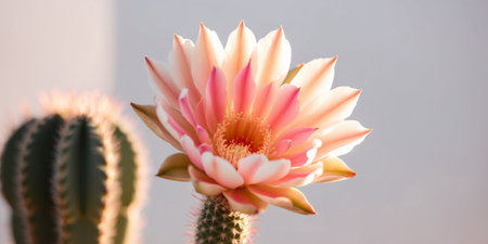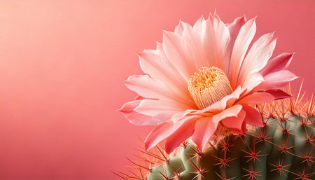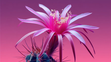 A breathtaking pink cactus flower blooms gracefully with spiky green stem, set against a soft gradient background. Perfect for nature lovers.
