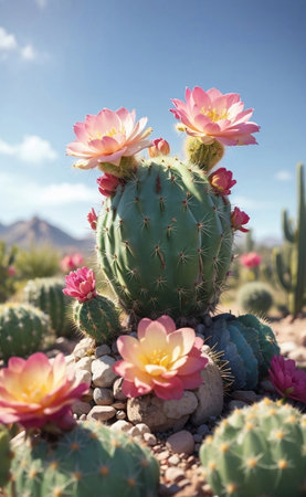 cactus in full bloom, with bright pink flowers, created with generative ai
