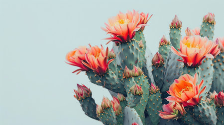 Close-up of a prickly pear cactus with vibrant orange and pink flowers against a clear light teal sky. The image showcases the intricate details of the cactus pads, spines, and blossoms, highlighting the beauty of desert flora in a clear and vibrant way.
