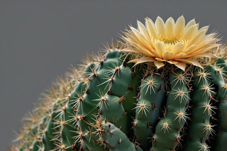 Cactus with yellow flower on gray background. Close up cactus