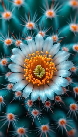 A close-up image captures the delicate beauty of a white cactus flower, surrounded by sharp spines and a vibrant teal backdrop.