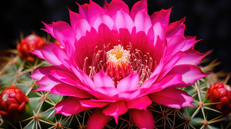 A stunning close-up of a cactus flower in full bloom, showcasing its vibrant colors and intricate details against a dark background.