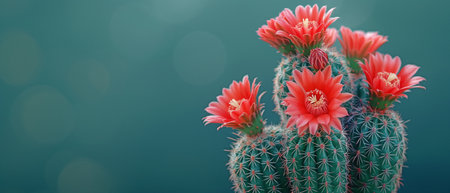 Cacti with red blossoms on a green backdrop that might be used as a Christmas decoration