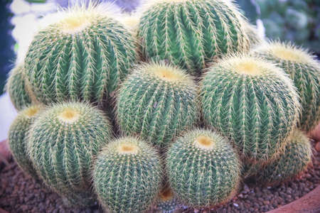 Barrel cactus, Clumping of big succulents plants with round shapes and sharp thorns in the rock garden. (Ferocactus)