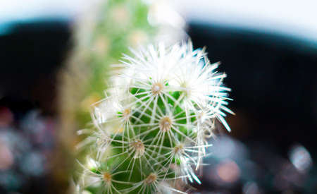 Green dusty cactus with big black spikes close-up macro background. Selective focus and image with shallow depth of field