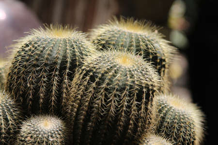 Closeup of couple of cacti grow in a pot. Background cactus with spines, small depth of view