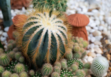 Close-up of Parodia cactus (Eriocactus), succulent plant with a green stem, round-shaped, spike, and wool on top. The ornamental and desert plants for the rock garden.